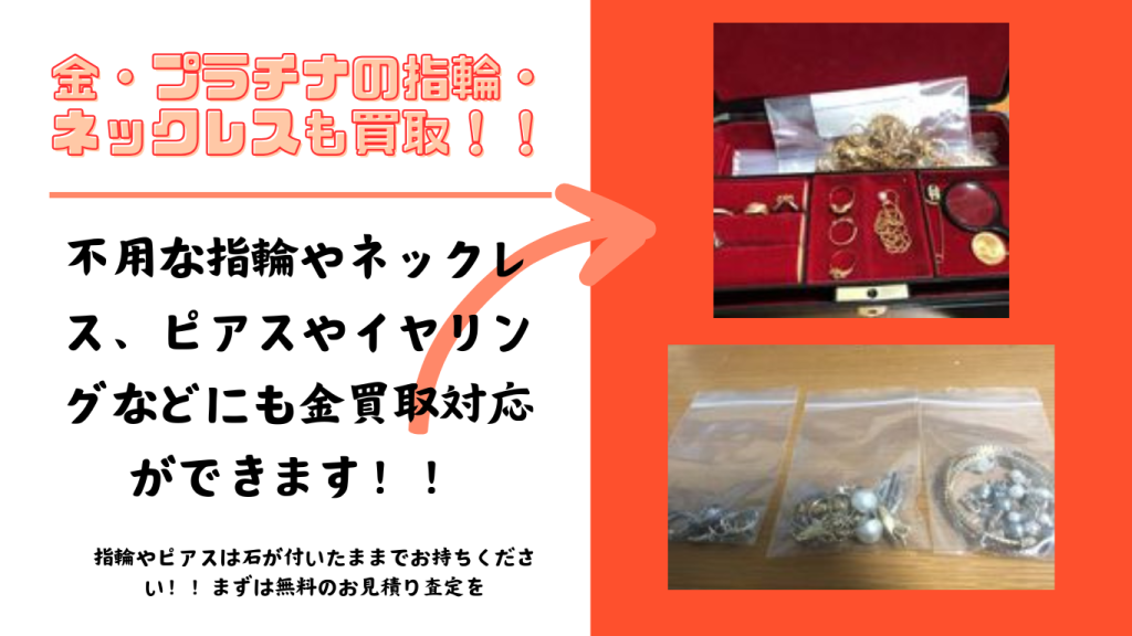またゴールドの中でも「ピンクゴールド」「ホワイトゴールド」「イエローゴールド」など色をつけている物もあり、指輪やネックレスの場合価値が上がる事があります。