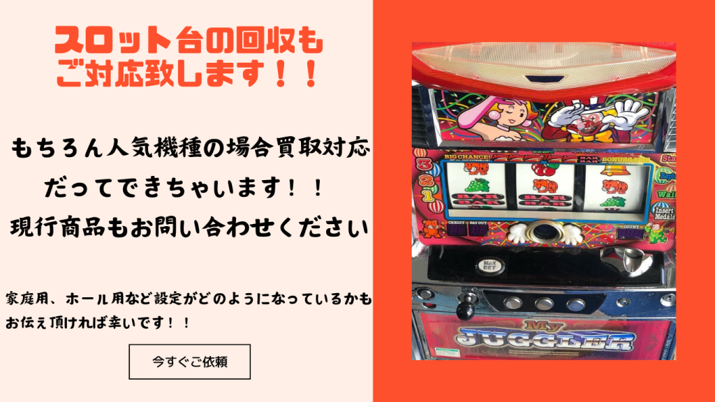 スロット台の引き取りの事なら「片付けルーム」までお問い合わせください。当社ではスロット台の買取対応も実施致します。もちろん家庭用かどうかや何の機種かによってもことなります。
