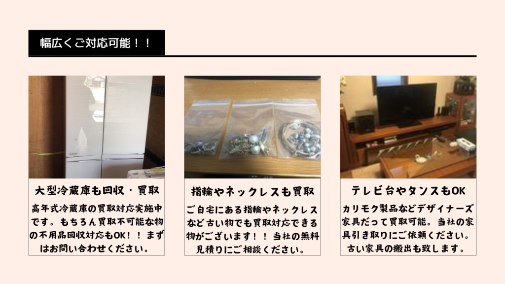 もちろん家電や家具の買取対応も実施しております。その他こんな物は買取できないだろう!!と思う物もお問い合わせ頂ければと思います!!リサイクル対応も幅広く実施している当社なら特別なご提案が可能となります。